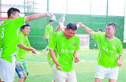 终场哨响后,,,,,,菲比88二队的队员很是兴奋,,,,,,他们用泼洒香槟的方法庆祝捧得冠军奖杯和2000元冠军奖励,,,,,,本届“PA视讯(中国区)官网-PlayAce·唐郡”杯济南市笼式五人制足球业余联赛就这样在一片喜庆的气氛中圆满落幕。。。。。。。。